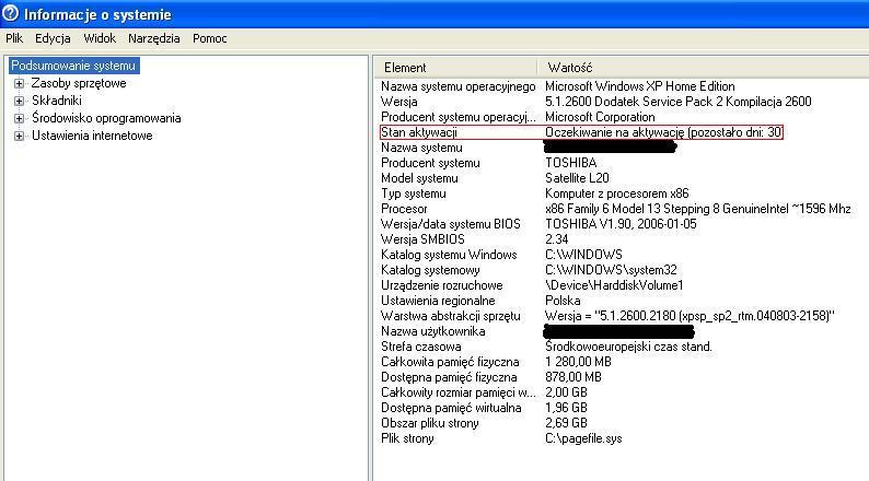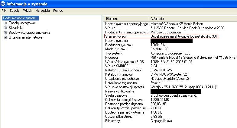 Aktywacja Windows XP na Toshiba Satellite L20