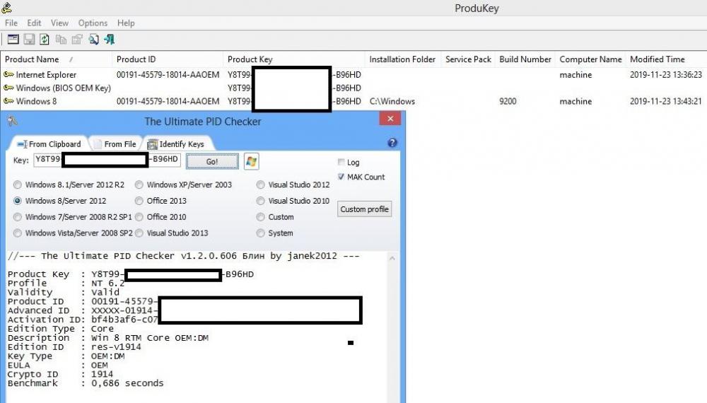 pid Dla lapka Medion Akoya E1318T, który niedawno kupiłem w lombardzie, i który ma naklejkę Windows 8 bez seriala od spodu obudowy, i który miał wgranego Windowsa 10 (pewnie to był jakiś "ciepły") zainstalowałem Windows 8, wcześniej sprawdzając programami: ProduKey i Ultimate PID Checker https://www.dobreprogramy.pl/The-Ultimate-PID-Checker,Program,Windows,101629.html https://www.chip.de/downloads/The-Ultimate-PID-Checker_76313770.html jaki był pierwotnie zainstalowany Windows. -